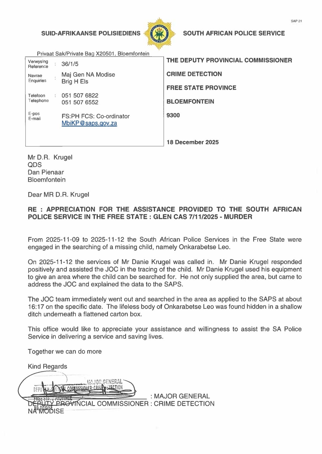 moordverdagte gesoek het as dit nie was vir mnr. Danie Krugel se hulp